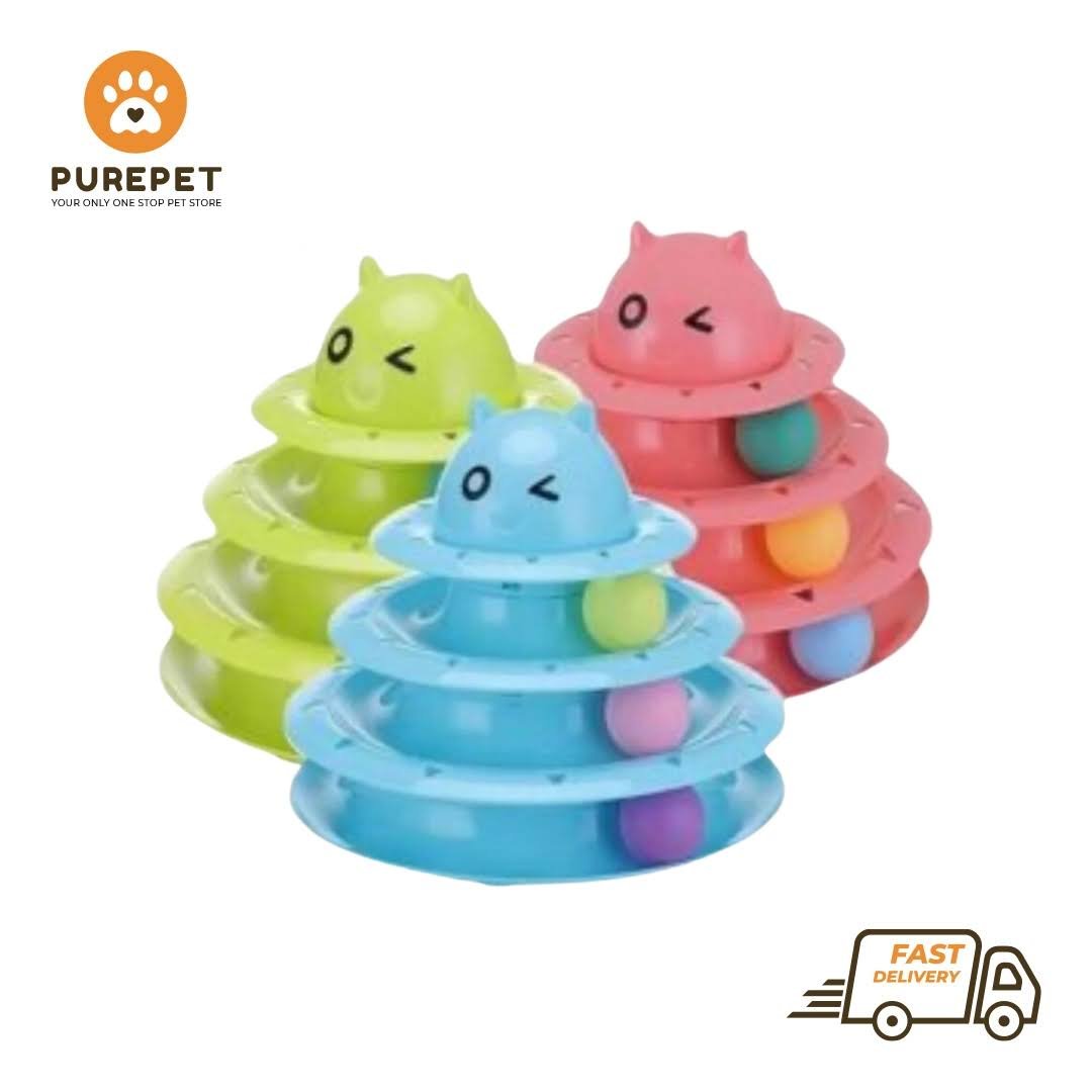 - Multilevel Tower: A three-tiered toy with colorful tracks that are adorned with a cheery face, this toy offers multiple levels of spinning ball for your cat.