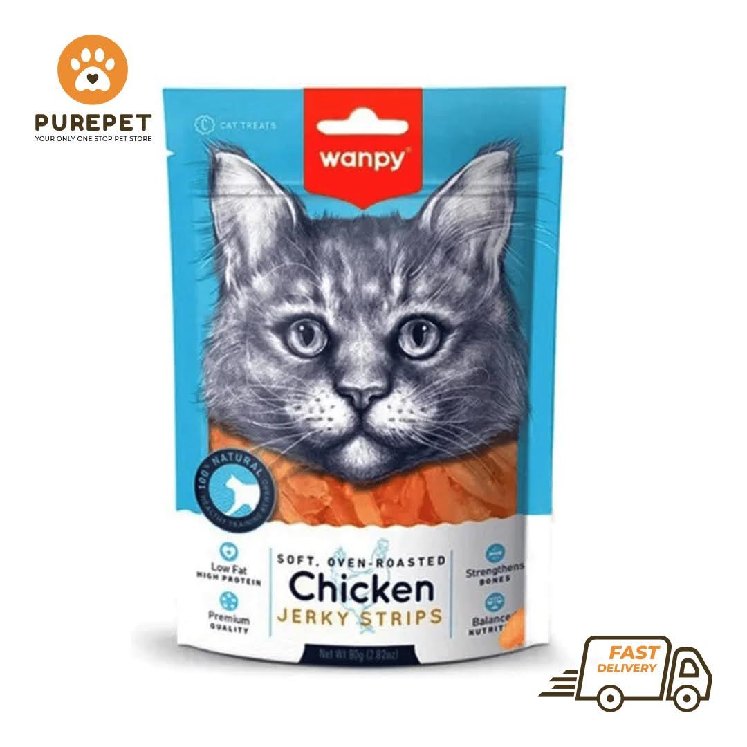 Wanpy Soft Chicken Jerky Strips in 80g convenient pouches, ideal for freshness. This pouch size works well for rewarding your cat, or giving it a tasty treat.